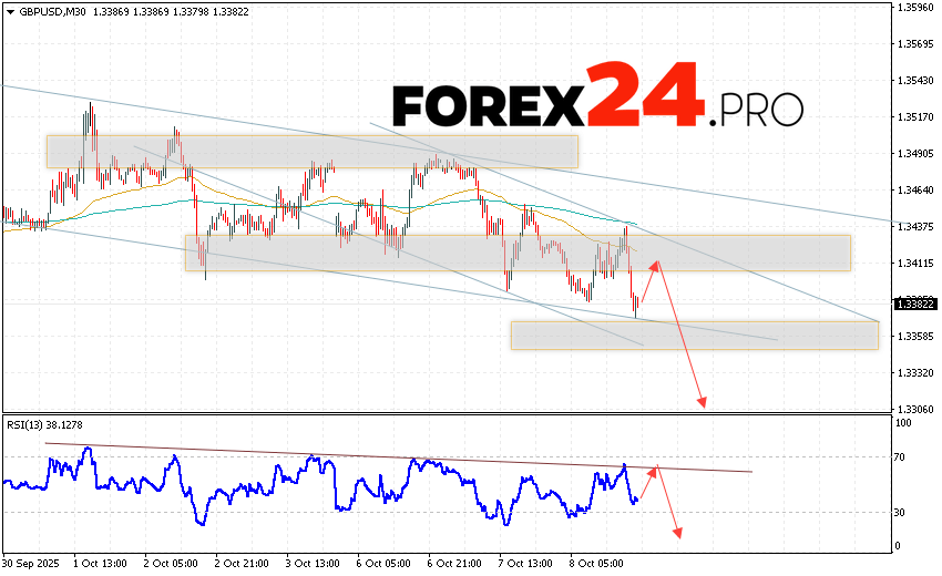 GBP/USD Forecast and Analysis for October 9, 2025 suggests an attempt to develop a bullish correction and test the resistance area near 1.3405. Subsequently, a continued decline in quotes with a target near 1.3305. An additional signal for a decline in the British Pound will be a test of the resistance line on the relative strength indicator (RSI). A strong rise in the British Pound against the US Dollar and a breakout of 1.3465 would cancel the downward trend. This would indicate a continued rise in the Forex pair with a potential target above 1.3585.