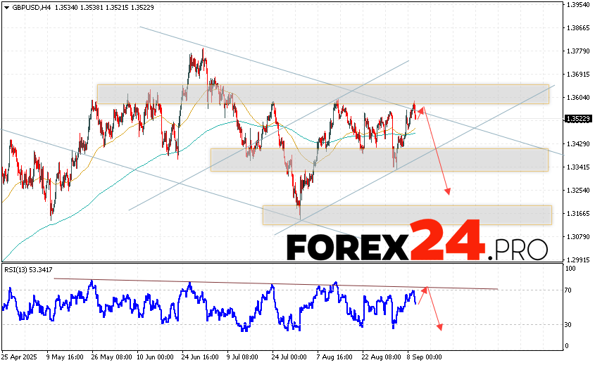 GBP/USD Forecast and Analysis for September 10, 2025 suggests an attempt to develop an increase and test the resistance area near the level of 1.3505. Then, the quotes will continue to fall with a target near the level of 1.3235. An additional signal in favor of the British Pound’s decline will be a test of the resistance line on the relative strength indicator (RSI). The cancellation of the fall option will be a strong growth of the British Pound against the US Dollar and a breakout of the 1.3675 area. This will indicate a continuation of the rise on the Forex pair with a potential target above the level of 1.3865.