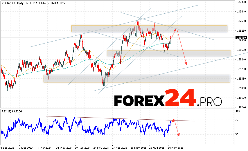 GBP/USD Weekly Forecast December 8 — 12, 2025 suggests an attempt at a bullish correction and a test of the resistance level near 1.3535. From there, we should expect continued decline in the currency pair with a target below 1.2595. A test of the trend line on the relative strength indicator (RSI) will serve as an additional signal for a decline. A strong rally and a breakout of 1.3775 would cancel the downside scenario for the GBP/USD pair. In this case, we should expect continued upside with a potential target above 1.4215.