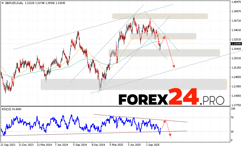GBP/USD Weekly Forecast November 10 – 14, 2025 suggests an attempt to develop a bullish correction and test the resistance level near 1.3295. From this point, we should expect the currency pair to continue to decline with a target below 1.2625. A test of the trend line on the relative strength indicator will serve as an additional signal of decline. A strong rally and a breakout of 1.3675 would cancel the downward trend for the GBP/USD pair. In this case, we should expect continued upward movement with a potential target above 1.4075.