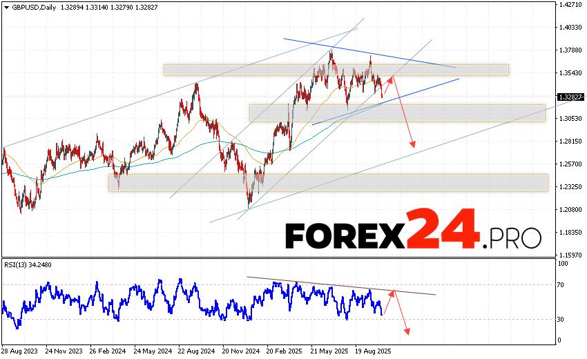 GBP/USD Weekly Forecast October 13 – 17, 2025 suggests an attempt to develop a bullish correction and test the resistance level near 1.3485. From there, we should expect continued decline in the currency pair with a target below 1.2775. A test of the trend line on the relative strength indicator (RSI) will serve as an additional signal for a decline. A strong rally and a breakout of 1.3865 would cancel out the downside scenario for the GBP/USD pair. In this case, we should expect continued upward movement with a potential target above 1.4205.