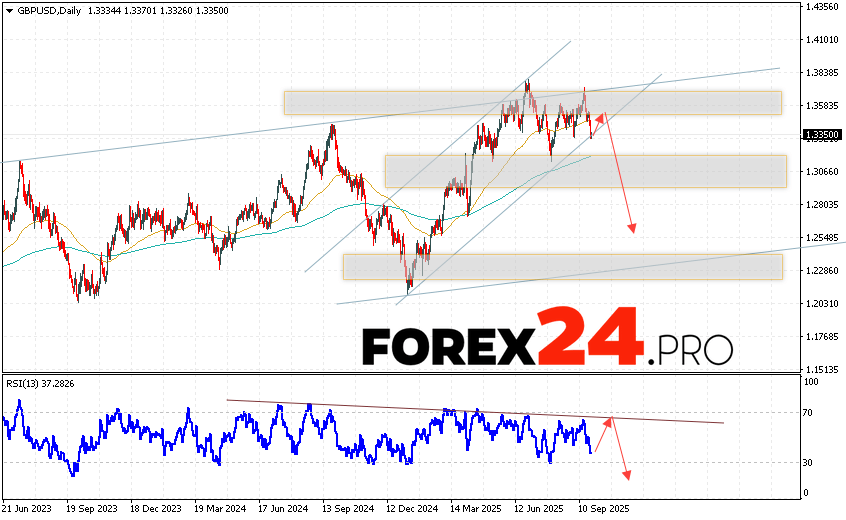 GBP/USD Weekly Forecast September 29 — October 3, 2025 suggests an attempt to develop a bullish correction and test the resistance level near 1.3475. From this point, we should expect a continued decline in the currency pair with a target below 1.2585. A test of the trend line on the relative strength indicator (RSI) would be an additional signal of decline. A strong rally and a breakout of 1.3865 would cancel out the downside scenario for the GBP/USD pair. In this case, we should expect continued growth with a potential target above 1.4175.