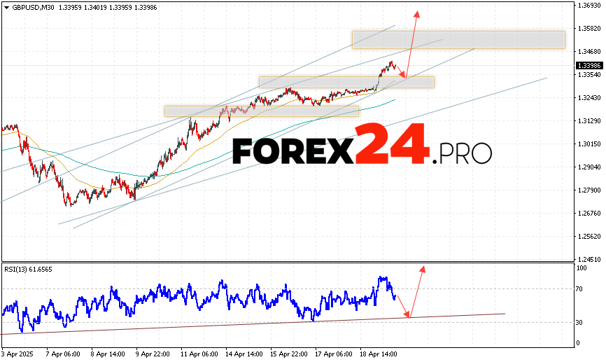 GBP/USD Forecast and Analysis for April 22, 2025 suggests an attempt to develop a decline and test the support area near the level of 1.3355. Then, continued growth with a target near the level of 1.3675. An additional signal in favor of the rise of the British Pound will be a test of the support line on the relative strength indicator (RSI). The cancellation of the growth option will be the fall of the British Pound against the US Dollar and a breakout of the 1.3255 area. This will indicate a continuation of the decline on the Forex pair with a potential target below the level of 1.3065.