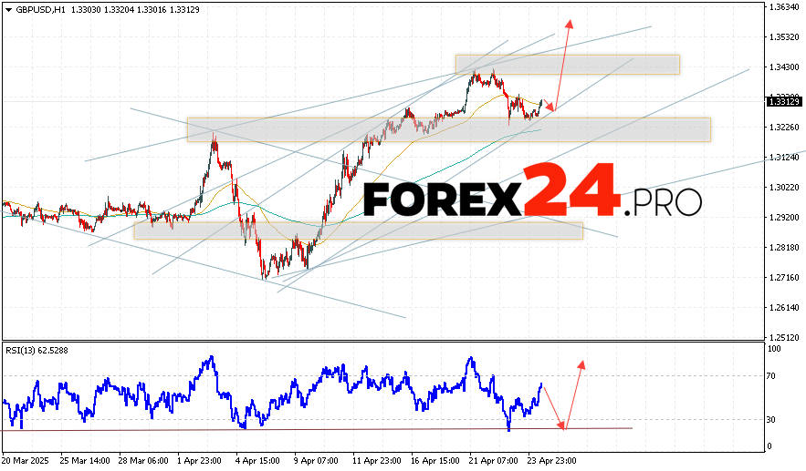 GBP/USD Forecast and Analysis for April 25, 2025 suggests an attempt to develop a decline and test the support area near the level of 1.3275. Then, continued growth with a target near the level of 1.3545. An additional signal in favor of the rise of the British Pound will be a test of the support line on the relative strength indicator (RSI). The cancellation of the growth option will be the fall of the British Pound against the US Dollar and a breakout of the 1.3175 area. This will indicate a continuation of the decline on the Forex pair with a potential target below the level of 1.2945.