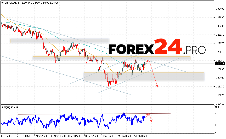 GBP/USD Forecast and Analysis for February 14, 2025 suggests an attempt to test the resistance area near the level of 1.2525. Then, a continuation of the fall with a target near the level of 1.2145. An additional signal in favor of the decline of the British Pound will be a test of the resistance line on the relative strength indicator (RSI). The cancellation of the fall option will be a strong growth of the British Pound against the US Dollar and a breakout of the 1.2565 area. This will indicate continued growth on the Forex pair with a potential target above the level of 1.2735.