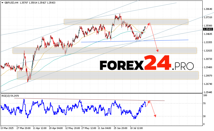 GBPUSD Forecast and Analysis for July 25, 2025 suggests an attempt to develop growth and test the resistance area near the 1.3605 level. Then, the quotes will continue to fall with a target near the 1.3195 level. An additional signal in favor of a decline in the British pound will be a test of the resistance line on the relative strength index (RSI). A strong rise in the British pound against the US dollar and a breakout of the 1.3865 area will cancel the decline scenario. This will indicate a continuation of the rise in the Forex pair with a potential target above the 1.4175 level.