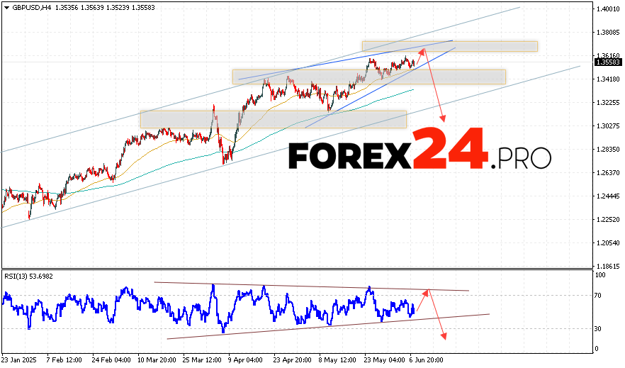 GBP/USD Forecast and Analysis for June 10, 2025 suggests an attempt to develop growth and test the resistance area near the 1.3615 level. Then, the quotes will continue to fall with a target near the 1.3045 level. An additional signal in favor of a decline in the British pound will be a test of the resistance line on the relative strength index (RSI). A strong rise in the British pound against the US dollar and a breakout of the 1.3745 area will cancel the decline scenario. This will indicate a continuation of the rise in the Forex pair with a potential target above the 1.3995 level.