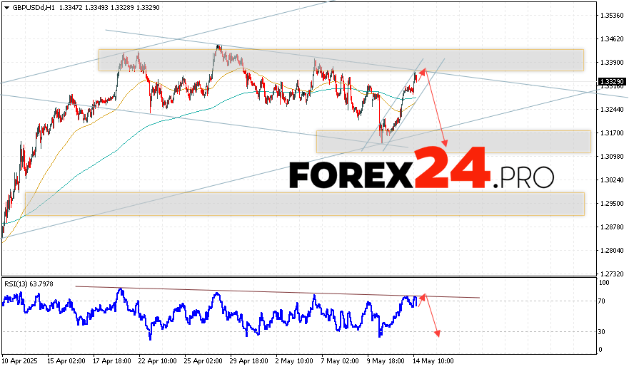 GBPUSD Forecast and Analysis for May 15, 2025 suggests an attempt to develop growth and test the resistance area near the level of 1.3345. Then, the continuation of the fall with the target near the level of 1.3165. An additional signal in favor of the GBP decline will be a test of the resistance line on the relative strength indicator (RSI). A strong growth of the British Pound against the U.S. Dollar and a breakdown of the 1.3425 area will cancel the downside option. This will indicate the continuation of growth on Forex pair with a potential target above the level of 1.3675.