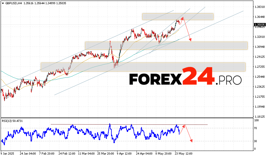 GBP/USD Forecast and Analysis for May 28, 2025 suggests an attempt at the development of a bullish correction and testing the resistance area near the level of 1.3645. Then, continuation of price drops with a target close to the level of 1.3265. An additional signal in favor of the British Pound’s depreciation is a test of the resistance line on the Relative Strength Index (RSI) indicator. Cancellation of the downward option will be a strong appreciation of the British Pound against the US Dollar and a breakout above the area of 1.3725. This indicates a continuation of the rise on the Forex pair with a potential target above the level of 1.3985.