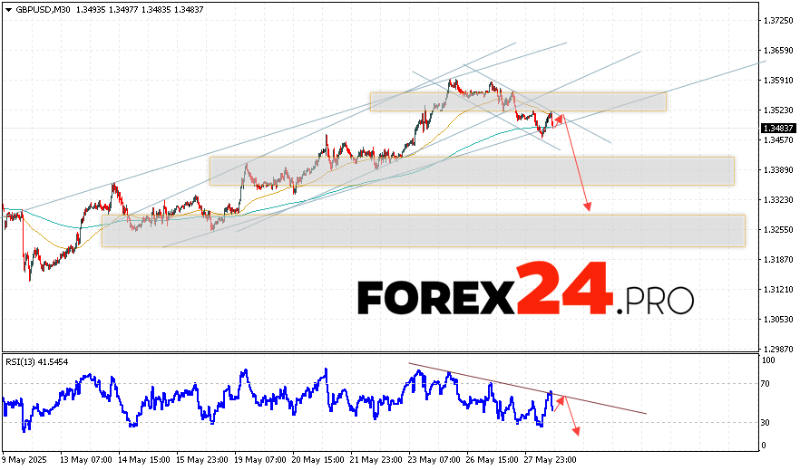 GBP/USD Forecast and Analysis for May 29, 2025 predicts an attempt to develop a bullish correction and testing the area of resistance near the level of 1.3505. Then, continuation of price drops with a target close to the level of 1.3315. An additional signal for the decline in the British Pound would be a test of the resistance line on the Relative Strength Index (RSI) indicator. Cancellation of the downside option will be a strong rise in the British Pound against the US Dollar and breaking through the area of 1.3565. This will indicate continuation of the rise on the Forex pair with potential target above the level of 1.3775.