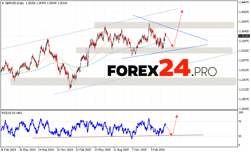 GBPUSD Weekly Forecast April 20 – 24, 2026 suggests an attempt to develop a bearish correction and test the support level near 1.3145. From here, we should expect continued growth in the pair with a target above 1.4175. A test of the trend line on the relative strength indicator (RSI) will be an additional signal in favor of an uptrend. A decline and a breakout of 1.2885 would cancel the upward trend for the GBP/USD pair. In this case, we should expect continued declines with a potential target below 1.2475.