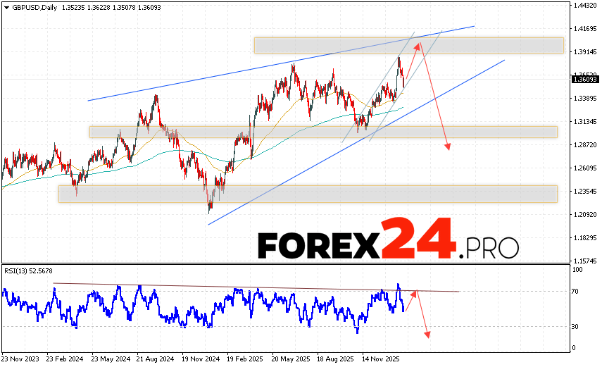 GBPUSD Weekly Forecast February 9 – 13, 2026 suggests an attempt to develop a bullish correction and test the resistance level near 1.3935. From there, we should expect continued decline in the currency pair with a target below 1.2845. A test of the trend line on the relative strength indicator (RSI) will serve as an additional signal for a decline. A strong rally and a breakout of 1.4255 would cancel the downside scenario for the GBP/USD pair. In this case, we should expect continued growth with a potential target above 1.4635.