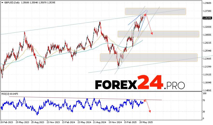 GBP/USD Weekly Forecast June 9 — 13, 2025 suggests an attempt to develop a bullish correction and test the resistance level near the 1.3665 area. From there, we can expect the currency pair to continue falling with a target below the 1.3065 area. An additional signal in favor of a decline will be a test of the trend line on the relative strength indicator. A strong rise and a breakout of the 1.3865 level will cancel the scenario of a decline in the pound-dollar pair. In this case, we should expect the pair to continue growing with a potential target above the 1.4275 level.