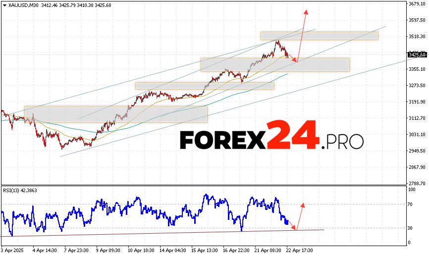 An additional signal in favor of the growth of XAU/USD quotes will be a test of the support line on the relative strength indicator (RSI indicator). The second signal will be a rebound from the lower border of the bullish channel. The cancellation of the growth scenario for Gold prices on April 23, 2025 will be a fall in prices and a breakout of the 3305 level. This will indicate a breakout of the support area and a continuation of the fall in asset quotes to the area below the 3255 level. It is worth expecting an acceleration of the growth of XAU/USD quotes with a breakout of the resistance area and a price close above the 3525 level.