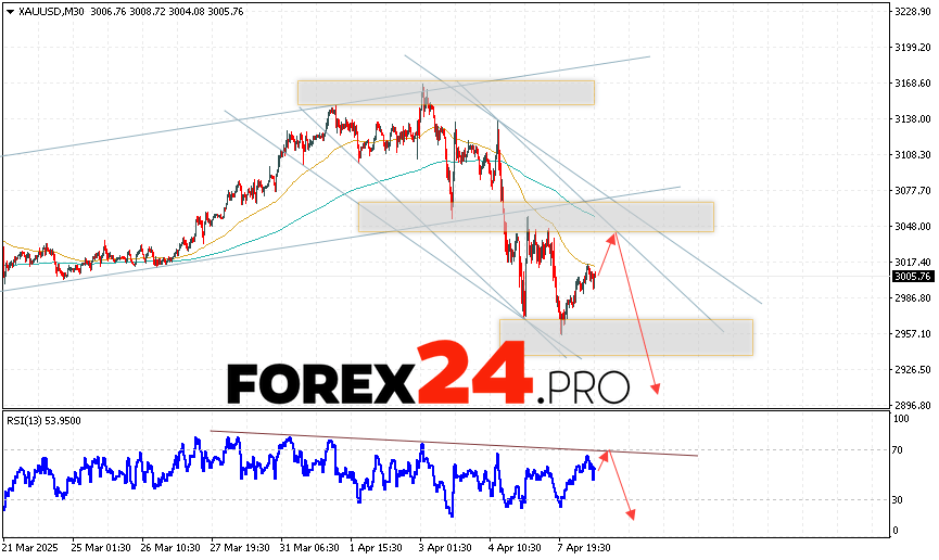 An additional signal in favor of a fall in XAU/USD quotes will be a test of the descending trend line on the relative strength indicator (RSI indicator). The second signal will be a rebound from the resistance level on the price chart. The cancellation of the Gold price fall scenario on April 9, 2025 will be a strong price increase and a breakout of the 3075 level. This will indicate a breakout of the resistance area and continued growth of the asset quotes to the area above the 3135 level. It is worth expecting an acceleration of the fall of XAU/USD quotes with a breakout of the support area and a price close below the 2985 level.