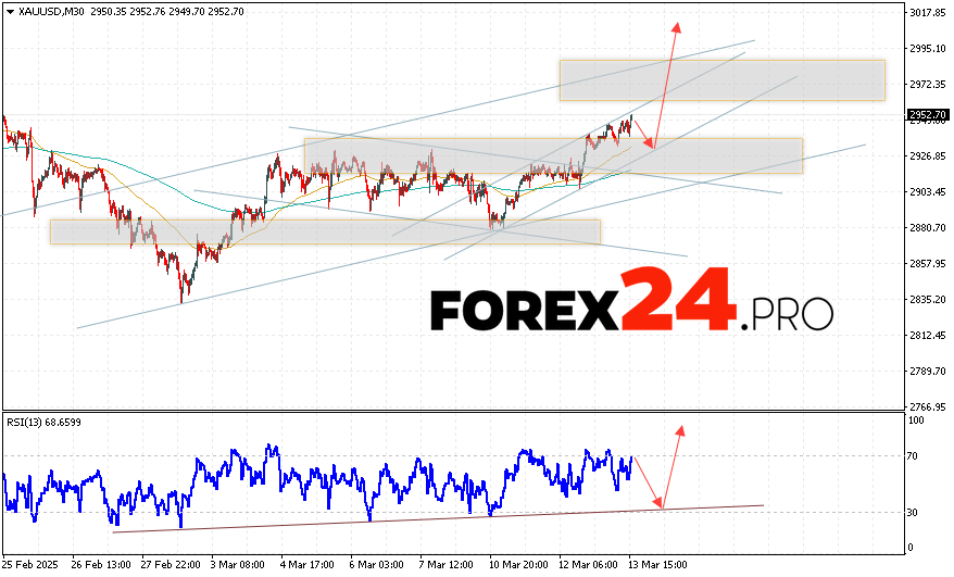 An additional signal in favor of the growth of XAU/USD quotes will be a test of the bullish trend line on the relative strength indicator (RSI indicator). The second signal will be a rebound from the lower border of the bullish channel. The cancellation of the Gold price increase option on March 14, 2025 will be a fall in prices and a breakout of the 2915 level. This will indicate a breakout of the support area and a continuation of the fall in asset quotes to the area below the 2865 level. It is worth expecting an acceleration of the growth of XAU/USD quotes with a breakout of the resistance area and a price close above the 2975 level.