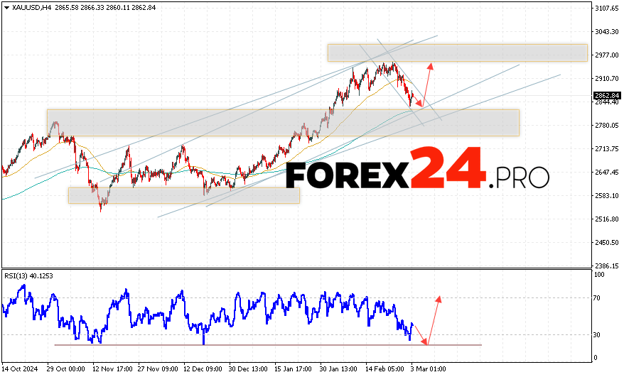 GOLD Forecast and Analysis for March 4, 2025 suggests an attempt to develop a bullish correction and test the resistance area near 2,905 USD, followed by a continued decline in gold prices with a target below 2,795 USD. The bearish scenario will be invalidated by strong growth and a breakout of the 2,915 USD level, signaling continued price appreciation with a potential target above 2,955 USD.