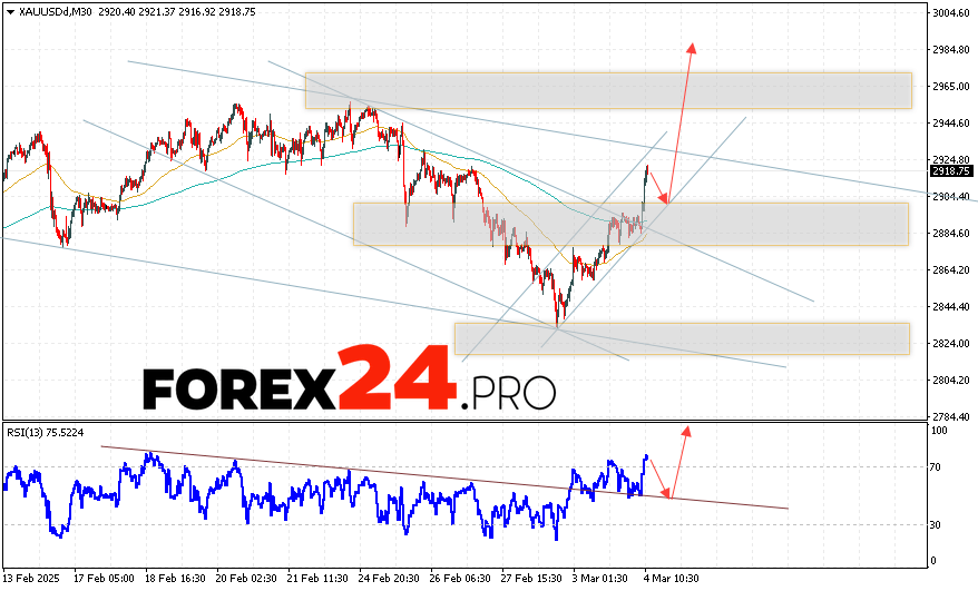 An additional signal in favor of the rise in XAU/USD quotes will be a test of the broken trend line on the relative strength indicator (RSI indicator). The second signal will be a rebound from the lower border of the bullish channel. The cancellation of the growth scenario for Gold prices on March 5, 2025 will be a fall in prices and a breakout of the 2875 level. This will indicate a breakout of the support area and a continuation of the fall in asset quotes to the area below the 2835 level. It is worth expecting an acceleration of the growth of XAU/USD quotes with a breakout of the resistance area and a price close above the 2935 level, which will indicate a breakout of the upper border of the descending channel.