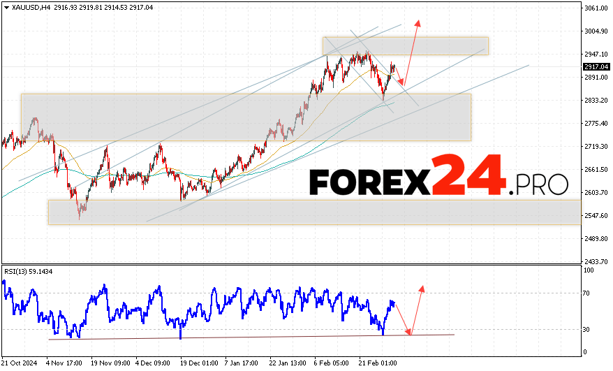 An additional signal in favor of the rise in XAU/USD quotes will be a test of the broken trend line on the relative strength indicator (RSI indicator). The second signal will be a rebound from the lower border of the bullish channel. The cancellation of the growth scenario for Gold prices on March 6, 2025 will be a fall in prices and a breakout of the 2865 level. This will indicate a breakout of the support area and a continuation of the fall in asset quotes to the area below the 2835 level. It is worth expecting an acceleration of the growth of XAU/USD quotes with a breakout of the resistance area and a price close above the 2935 level.