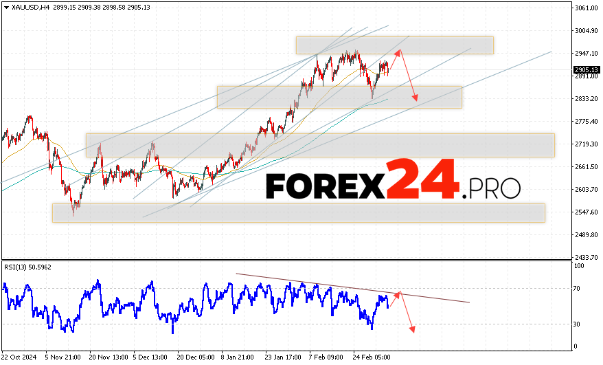 An additional signal in favor of a fall in XAU/USD quotes will be a test of the descending trend line on the relative strength indicator (RSI indicator). The second signal will be a rebound from the upper border of the Double Top reversal pattern. The cancellation of the Gold price fall scenario on March 7, 2025 will be a strong price increase and a breakout of the 2975 level. This will indicate a breakout of the resistance area and continued growth of the asset quotes to the area above the 3005 level. It is worth expecting an acceleration of the fall of XAU/USD quotes with a breakout of the support area and a price close below the 2845 level, which will indicate a breakout of the lower border of the bullish channel.