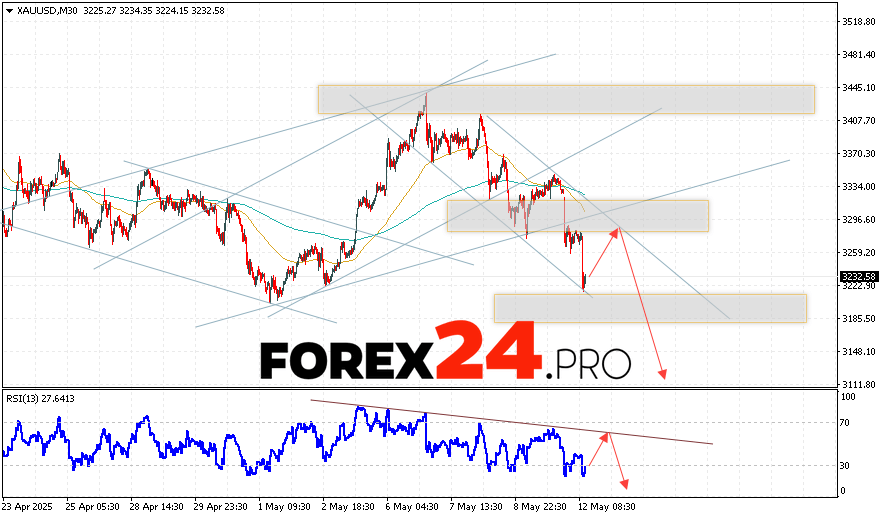 An additional signal in favor of XAU/USD quotes decline will be a test of the resistance line on the relative strength indicator (RSI indicator). The second signal will be a rebound from the upper boundary of the bearish channel. A strong rise in prices and a breakdown of the 3315 level will cancel the variant of the Gold price drop on May 13, 2025. This will indicate the breakdown of the resistance area and the continuation of growth of asset quotes to the area above the level of 3365. We should expect XAU/USD to accelerate the decline with the breakdown of the support area and the price closing under the level 3205.