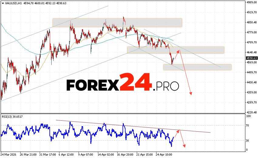 GOLD Forecast and XAU/USD Analysis for April 29, 2026 suggests an attempt to develop a bearish price correction and test the resistance area near 4645. Subsequently, a continued decline in base metal prices with a target below 4360. A strong rally in the market and a breakout of 4815 would cancel the gold price decline scenario. This would indicate a continued rise in gold with a potential target above 5025.