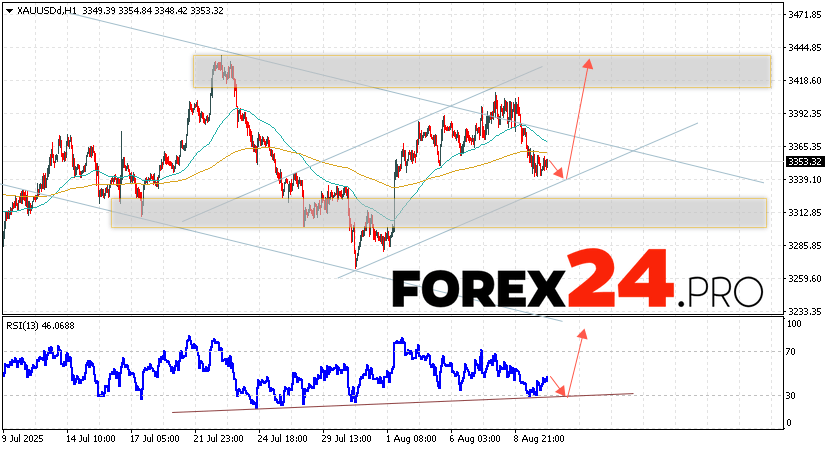 GOLD Forecast and XAU/USD Analysis for August 13, 2025 suggests an attempt to develop a bearish price correction and test the support area near the level of 3340. Further, the continuation of the rise in non-ferrous metal quotes with a target above the level of 3435. The cancellation of the option of growth in Gold prices will be a fall in the value of the asset in the markets and a breakout of the level of 3315. This will indicate a continuation of the decline in the price of Gold with a potential target below the mark of 3265.