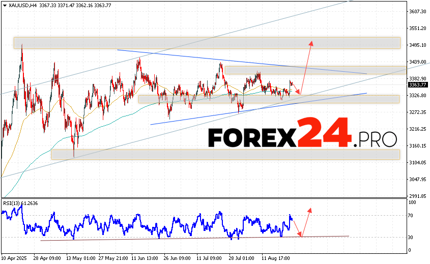 GOLD Forecast and XAU/USD Analysis for August 26, 2025 suggests an attempt to develop a bearish price correction and test the support area near the 3325 level. Further, a continuation of the rise in non-ferrous metal quotes with a target above the 3485 level. The cancellation of the growth scenario for Gold prices will be a fall in the value of the asset on the markets and a breakout of the 3300 level. This will indicate a continuation of the decline in Gold prices with a potential target below the 3265 mark.