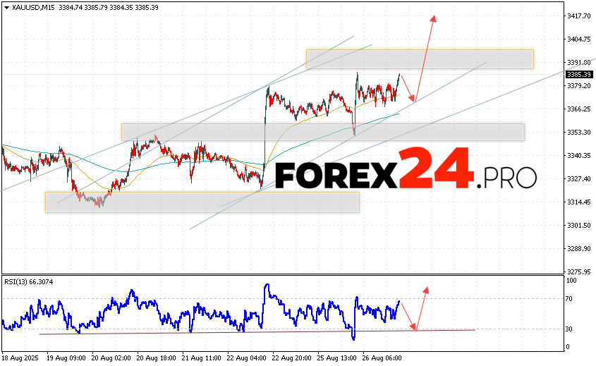 An additional signal in favor of the growth of XAU/USD quotes will be a test of the support line on the relative strength indicator (RSI indicator). The second signal will be a rebound from the lower border of the bullish channel. The cancellation of the growth scenario for Gold prices on August 27, 2025 will be a fall in quotes and a breakout of the 3355 level. This will indicate a breakout of the support area and a continuation of the fall in asset quotes to the area below the 3325 level. It is worth expecting an acceleration in the growth of XAU/USD quotes with a breakout of the resistance area and a price close above the 3405 level.