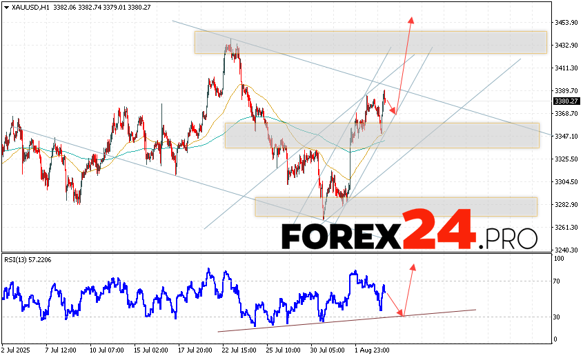 GOLD Forecast and XAU/USD Analysis for August 6, 2025 suggests an attempt to develop a bearish price correction and test the support area near the 3365 level. Further, the rise in non-ferrous metal quotes will continue with a target above the 3465 level. A fall in the asset’s value on the markets and a breakout of the 3325 level will cancel the option of growth in gold prices. This will indicate a continuation of the decline in the price of gold with a potential target below the 3265 mark.