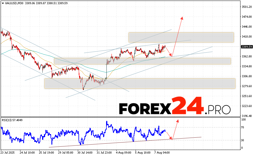 GOLD Forecast and XAU/USD Analysis for August 8, 2025 suggests an attempt to develop a bearish price correction and test the support area near the 3365 level. Further, the rise in non-ferrous metal quotes will continue with a target above the 3475 level. A fall in the asset’s value on the markets and a breakout of the 3345 level will cancel the option of growth in gold prices. This will indicate a continuation of the decline in the price of gold with a potential target below the 3275 mark.