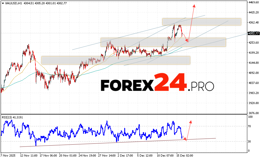GOLD Forecast and XAU/USD Analysis for December 16, 2025 suggests an attempt to develop a bearish price correction and a test of the support area near 4255. Subsequently, continued growth in base metal prices with a target above 4435. A decline in the asset’s market value and a breakout of 4165 would cancel the upward price scenario for gold. This would indicate a continued decline in gold prices with a potential target below 4075.
