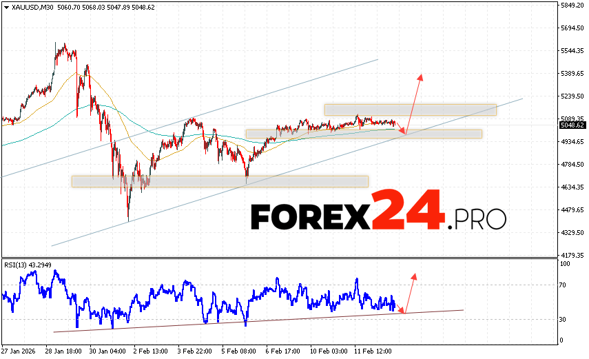 GOLD Forecast and XAU/USD Analysis for February 13, 2026 suggests an attempt to develop a bearish price correction and test the support area near 4945. Subsequently, the base metal’s price growth will continue with a target above 5385. The potential for gold price growth will be cancelled if prices fall on the market and the 4805 level is broken. This will indicate a continued decline in the gold price with a potential target below 4525.