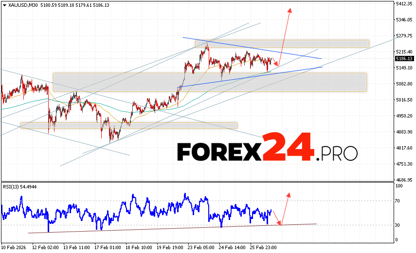 GOLD Forecast and XAU/USD Analysis for February 27, 2026 suggests an attempt at a bearish price correction and a test of the support area near 5145. Subsequently, base metal prices are expected to continue rising with a target above 5375. A decline in the market price and a breakout of 5065 would cancel out this upward price movement in gold. This would indicate a continued decline in gold prices with a potential target below 4835.