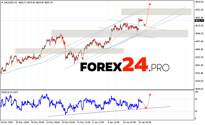 An additional signal favoring an uptrend in XAU/USD quotes will be a test of the bullish support line on the relative strength indicator (RSI). A second signal will be a rebound from the upper boundary of the descending correction channel. A decline in gold prices and a breakout of 4515 would cancel the upward price scenario for January 20, 2026. This would indicate a breakout of the support area and a continued decline in the asset’s price below 4435. XAU/USD price growth should accelerate with a breakout of the resistance area and a price close above 4715.