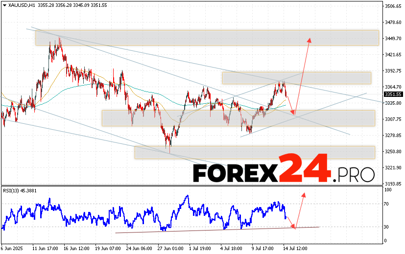 GOLD Forecast and XAU/USD Analysis for July 15, 2025suggests an attempt to develop a bearish price correction and test the support area near the 3310 level. Further, the growth of non-ferrous metal quotes will continue with a target above the 3450 level. A fall in the asset’s value on the markets and a breakout of the 3280 level will cancel the option of growth in gold prices. This will indicate a continuation of the decline in the price of gold with a potential target below the 3235 mark.
