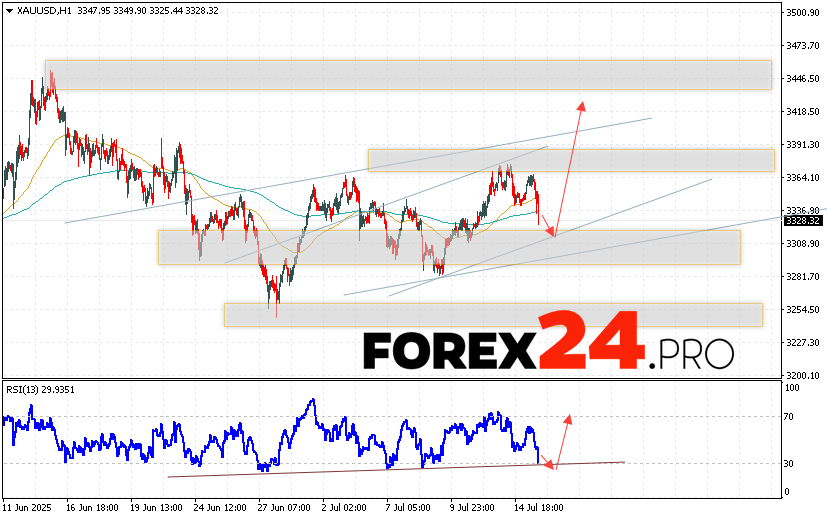 GOLD Forecast and XAU/USD Analysis for July 16, 2025 suggests an attempt to develop a bearish price correction and test the support area near the 3315 level. Further, the growth of non-ferrous metal quotes will continue with a target above the 3425 level. A fall in the asset’s value on the markets and a breakout of the 3280 level will cancel the option of growth in gold prices. This will indicate a continuation of the decline in the price of gold with a potential target below the 3245 mark.
