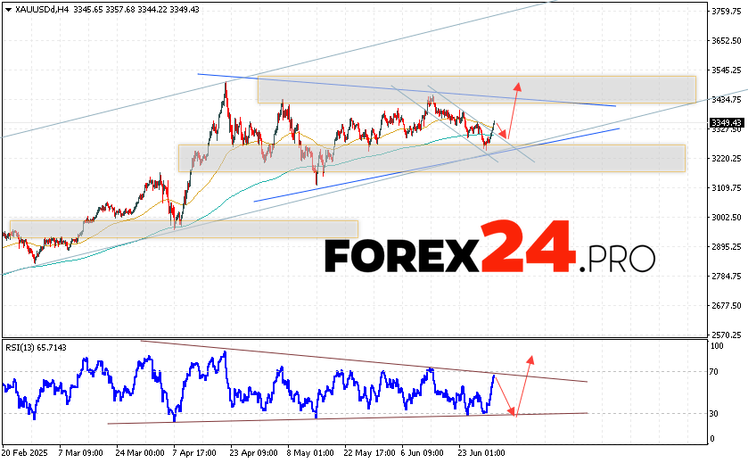 An additional signal in favor of growth in XAU/USD quotes will be a test of the support line on the relative strength indicator (RSI). The second signal will be a rebound from the upper border of the bearish channel. A decline in quotes and a breakout of the 3215 level will cancel the option of growth in gold prices on July 2, 2025. This will indicate a breakout of the support area and a continuation of the decline in asset quotes to the area below the 3165 level. An acceleration in the growth of XAU/USD quotes should be expected with a breakout of the resistance area and the price closing above the 3445 level, which will indicate a breakout of the upper border of the “Triangle” model and the beginning of the pattern’s implementation with targets at the top.