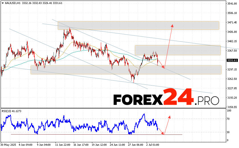 An additional signal in favor of the growth of XAU/USD quotes will be a test of the support line on the relative strength indicator (RSI indicator). The second signal will be a rebound from the upper border of the bearish channel. The cancellation of the growth scenario for Gold prices on July 4, 2025 will be a fall in quotes and a breakout of the 3235 level. This will indicate a breakout of the support area and a continuation of the fall in asset quotes to the area below the 3175 level. It is worth expecting an acceleration in the growth of XAU/USD quotes with a breakout of the resistance area and the price closing above the 3415 level, which will indicate a breakout of the upper border of the bearish channel.