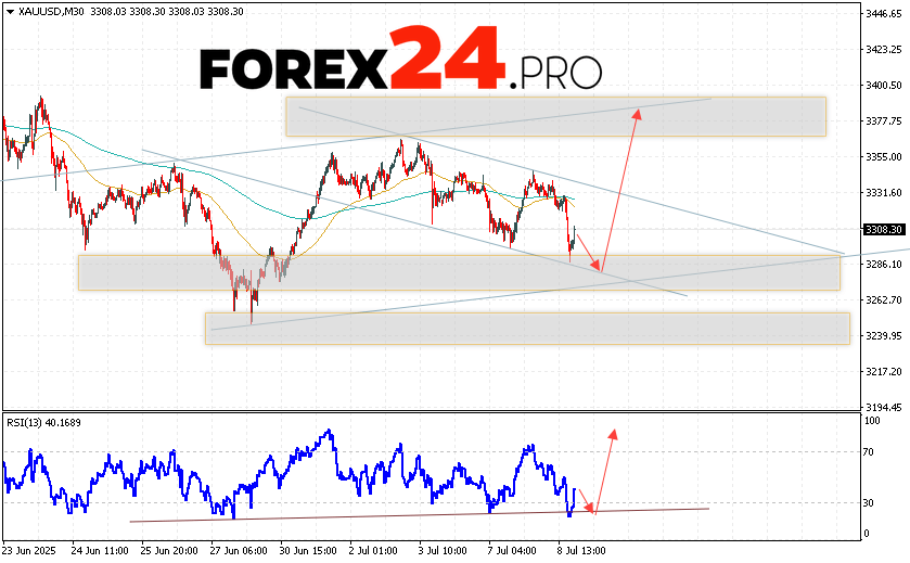GOLD Forecast and XAU/USD Analysis for July 9, 2025 suggests an attempt to develop a bearish price correction and test the support area near the 3285 level. Further, the growth of non-ferrous metal quotes will continue with a target above the 3375 level. A fall in the asset’s value on the markets and a breakout of the 3255 level will cancel the option of growth in gold prices. This will indicate a continuation of the decline in the price of gold with a potential target below the 3195 mark.