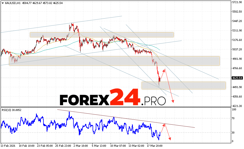 GOLD Forecast and XAU/USD Analysis for March 20, 2026 suggests an attempt to develop a bullish price correction and test the resistance area near 4765. Subsequently, a continued decline in base metal prices with a target below 4275. A strong rally in the market and a breakout of 4945 would cancel the gold price decline scenario. This would indicate a continued rise in gold with a potential target above 5465.