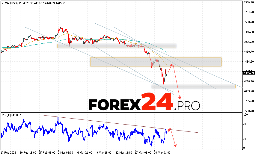 GOLD Forecast and XAU/USD Analysis for March 24, 2026 suggests an attempt to develop a bullish price correction and test the resistance area near 4645. Subsequently, a continued decline in base metal prices with a target below 3805. A strong rally in the market and a breakout of 4885 would cancel the gold price decline scenario. This would indicate a continued rise in gold with a potential target above 5365.