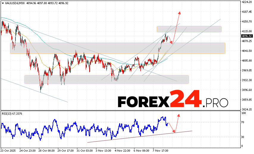 GOLD Forecast and XAU/USD Analysis for November 11, 2025 suggests an attempt to develop a bearish price correction and a test of the support area near 4075. Subsequently, continued growth in base metal prices with a target above 4185. A decline in the asset’s market value and a breakout of 4015 would cancel the upward price scenario for gold. This would indicate a continued decline in gold prices with a potential target below 3865.