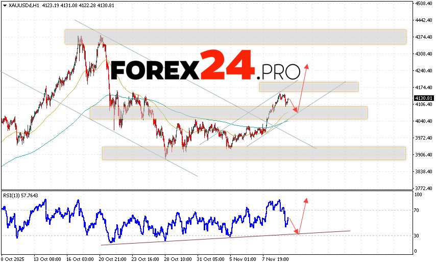 GOLD Forecast and XAU/USD Analysis for November 13, 2025 suggests an attempt to develop a bearish price correction and a test of the support area near 4080. Subsequently, continued growth in base metal prices with a target above 4265. A decline in the asset’s market value and a breakout of 4025 would cancel the upward price scenario for gold. This would indicate a continued decline in gold prices with a potential target below 3925.