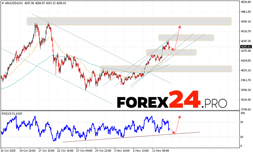 GOLD Forecast and XAU/USD Analysis for November 14, 2025 suggests an attempt to develop a bearish price correction and a test of the support area near 4155. Subsequently, continued growth in base metal prices with a target above 4345. A decline in the market price and a breakout of 4095 would cancel the upward price scenario for gold. This would indicate a continued decline in gold prices with a potential target below 3865.