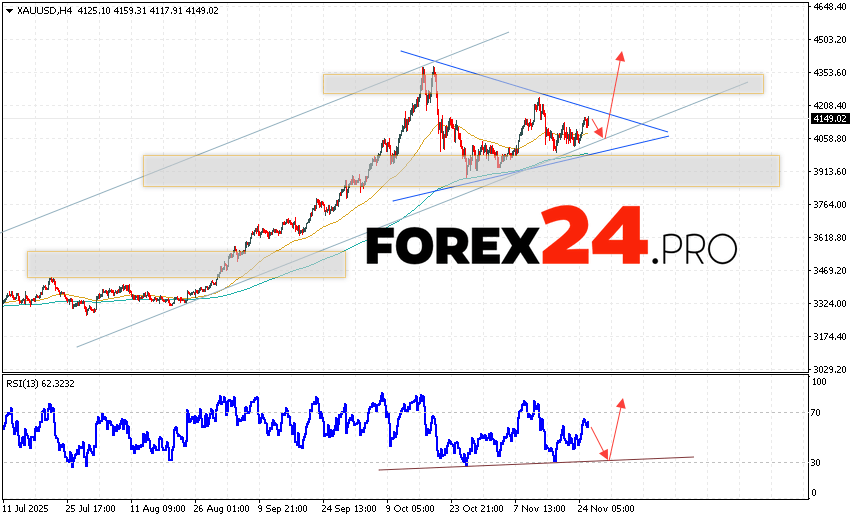 GOLD Forecast and XAU/USD Analysis for November 26, 2025 suggests an attempt at a bearish price correction and a test of the support area near 4055. Subsequently, base metal prices are expected to continue rising with a target above 4375. A decline in the market price and a breakout of 3885 would cancel out the gold price rally. This would indicate a continued decline in gold prices with a potential target below 3775.