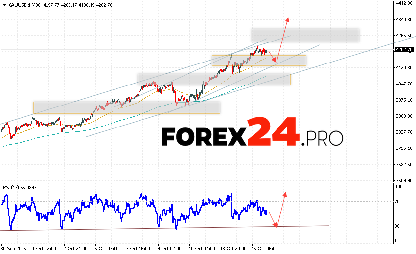 GOLD Forecast and XAU/USD Analysis for October 16, 2025 suggests an attempt to develop a bearish price correction and a test of the support area near 4145. Subsequently, a continued rise in base metal prices with a target above 4345. A decline in the market price and a breakout of 4105 would cancel the upward price scenario for gold. This would indicate a continued decline in gold prices with a potential target below 3965.