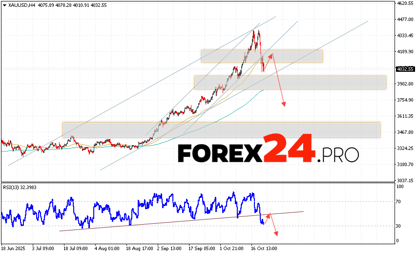 An additional signal favoring a decline in XAU/USD quotes will be a test of the broken support line on the relative strength indicator (RSI). A second signal will be a rebound from the lower boundary of the bullish channel. A strong rally and a breakout of 4335 would cancel the gold price decline scenario on October 23, 2025. This would indicate a breakout of the resistance area and continued price growth above 4565. Expect the XAU/USD price decline to accelerate with a breakout of the support area and a price close below 4005.