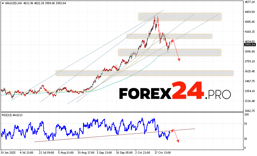 An additional signal favoring a decline in XAU/USD quotes will be a test of the broken support line on the relative strength indicator (RSI). A second signal will be a rebound from the lower boundary of the bullish channel. A strong rally and a breakout of 4125 would cancel the gold price decline scenario on October 30, 2025. This would indicate a breakout of the resistance area and continued price growth above 4375. Expect the XAU/USD price decline to accelerate with a breakout of the support area and a price close below 3945.
