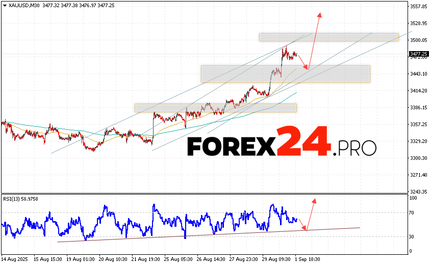 GOLD Forecast and XAU//USD Analysis for September 2, 2025 suggests an attempt to develop a bearish price correction and test the support area near the 3455 level. Further, the continuation of the rise in non-ferrous metal quotes with a target above the 3535 level. The cancellation of the growth scenario for Gold prices will be a fall in the value of the asset on the markets and a breakout of the 3405 level. This will indicate a continuation of the decline in Gold prices with a potential target below the 3355 mark.
